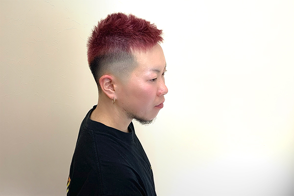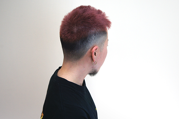 | カット | サイド~バックを1ミリからのフェードを入れてカット。全体にソフトモヒカンラインで短くカットし、削ぎを入れて動きを出します。 |