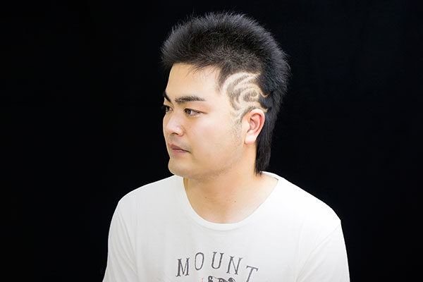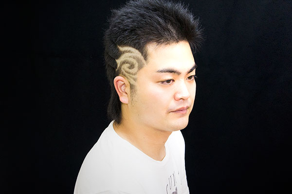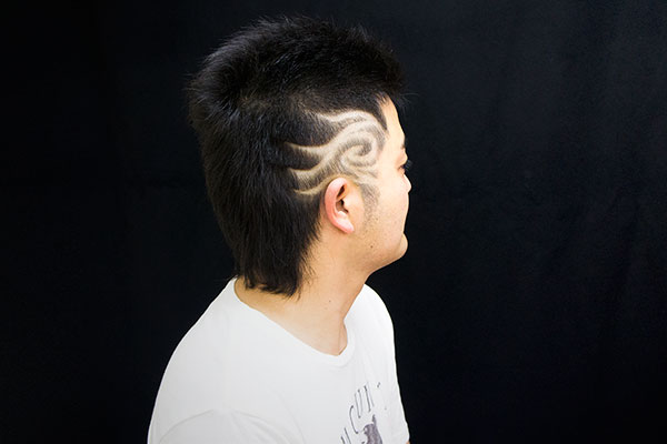 | カット | 両サイドを6~9mmのバリカンで刈上げ、トライバル模様のバリアート!バックの長い部分までラインを入れます。 |