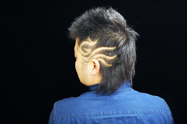 | カット | 両サイドを6~9mmのバリカンで刈上げ、トライバル模様のバリアート!バックの長い部分までラインを入れます。 |